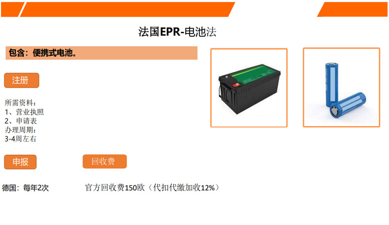 答:法國EPR是2022年1月1日強制,德國包裝法7月1日,德國WEEE和電池法是2023年1月1日;
