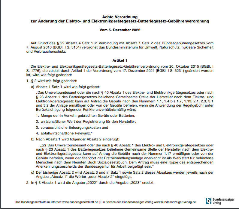最近,德國(guó)聯(lián)邦法規(guī)公布了2023年德國(guó)最新的規(guī)定EPR最新的官費(fèi)價(jià)格。WEEE2023年將大幅調(diào)整電池支付的兩項(xiàng)費(fèi)用。